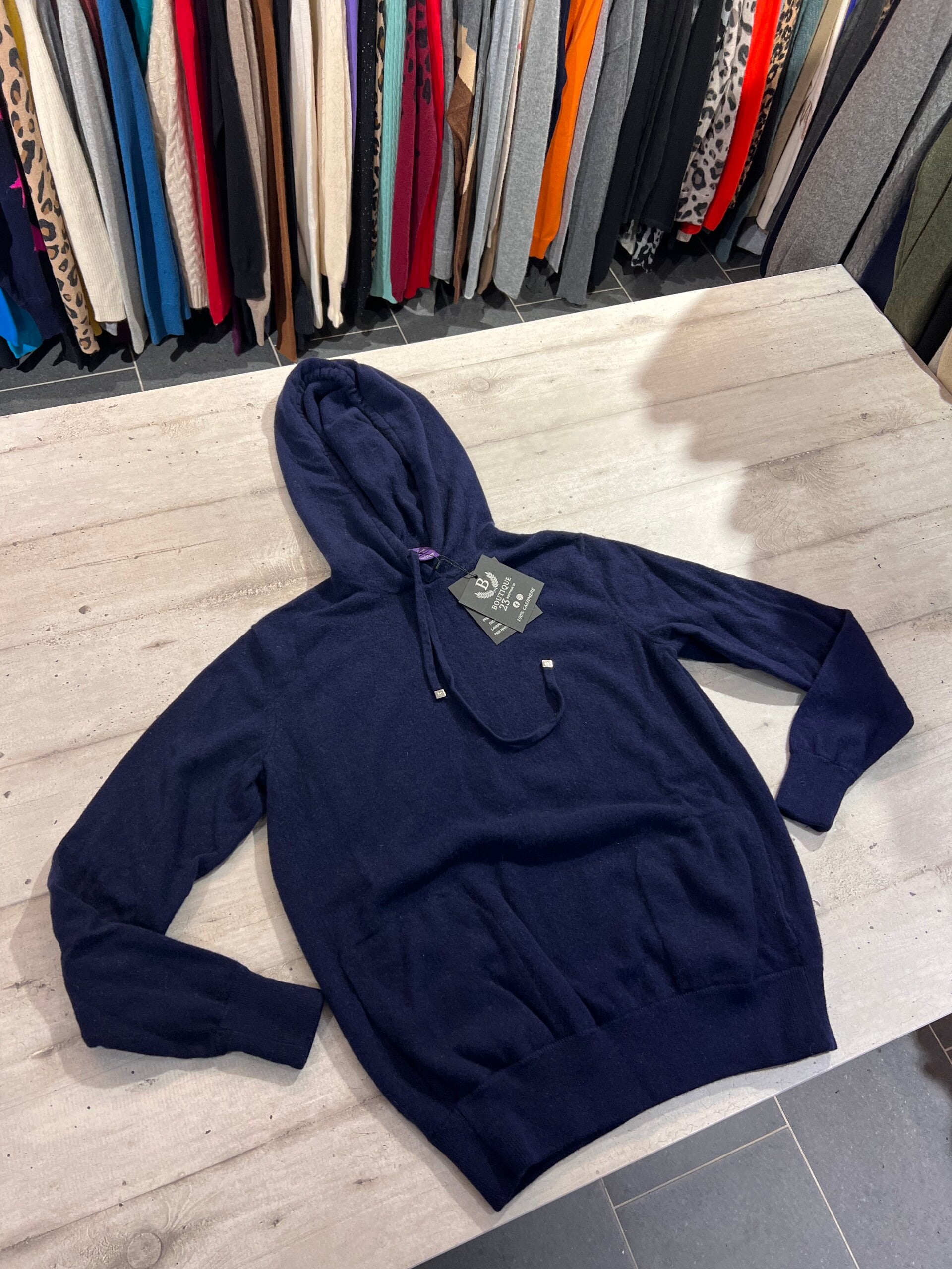 Felpa in maglia 100% Puro Cashmere Donna. Ralph Lauren Purple Label. Taglia M. Felpa di una morbidezza unica, molto pesante, spessa e calda con tasche laterali e cappuccio. Misure: Spalle 39cm, sotto ascelle 49,5cm, lunghezza 61cm