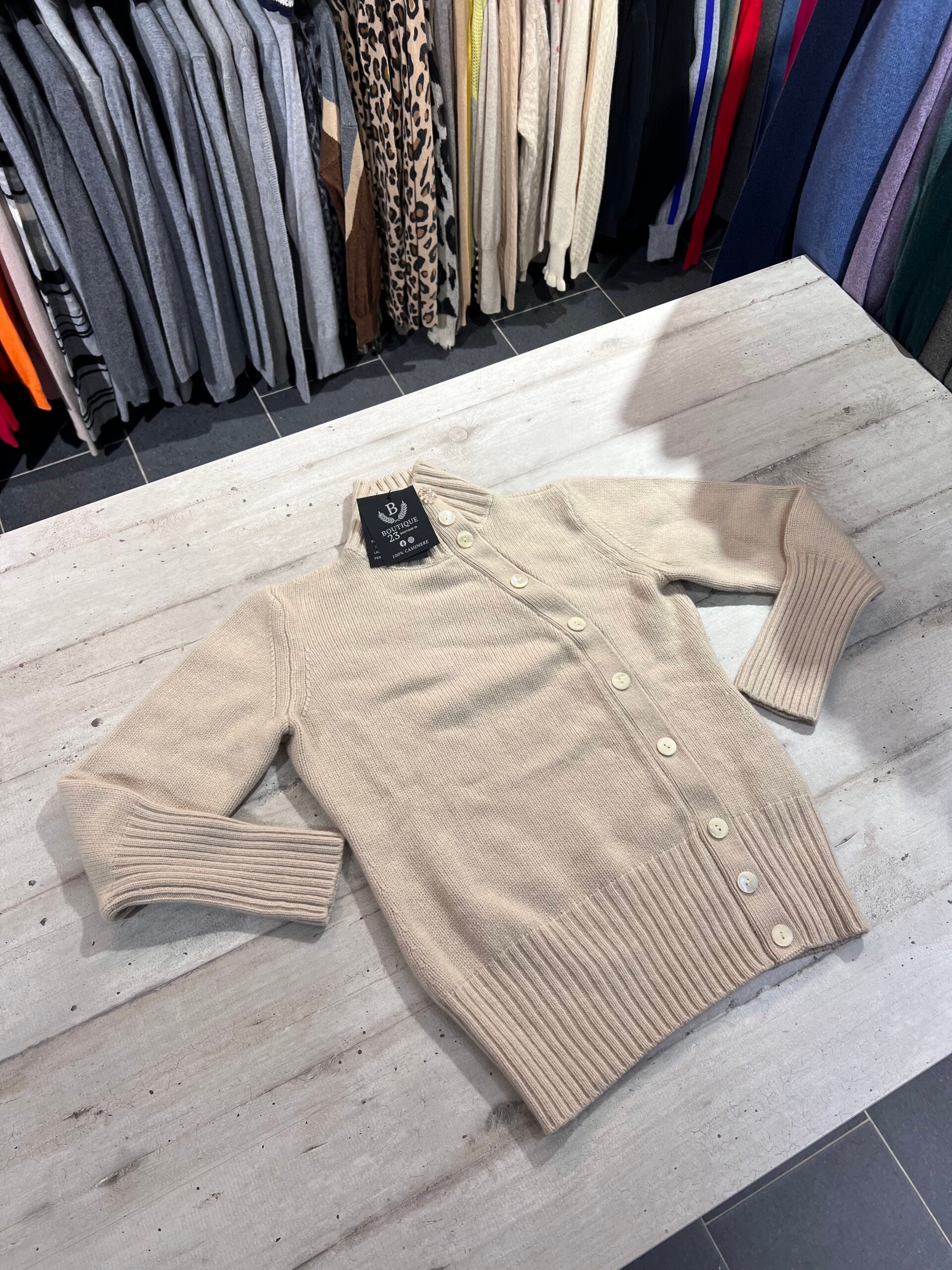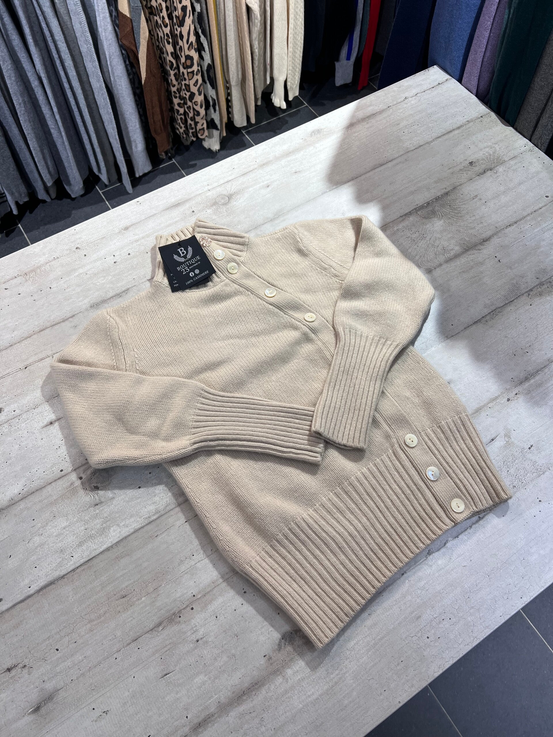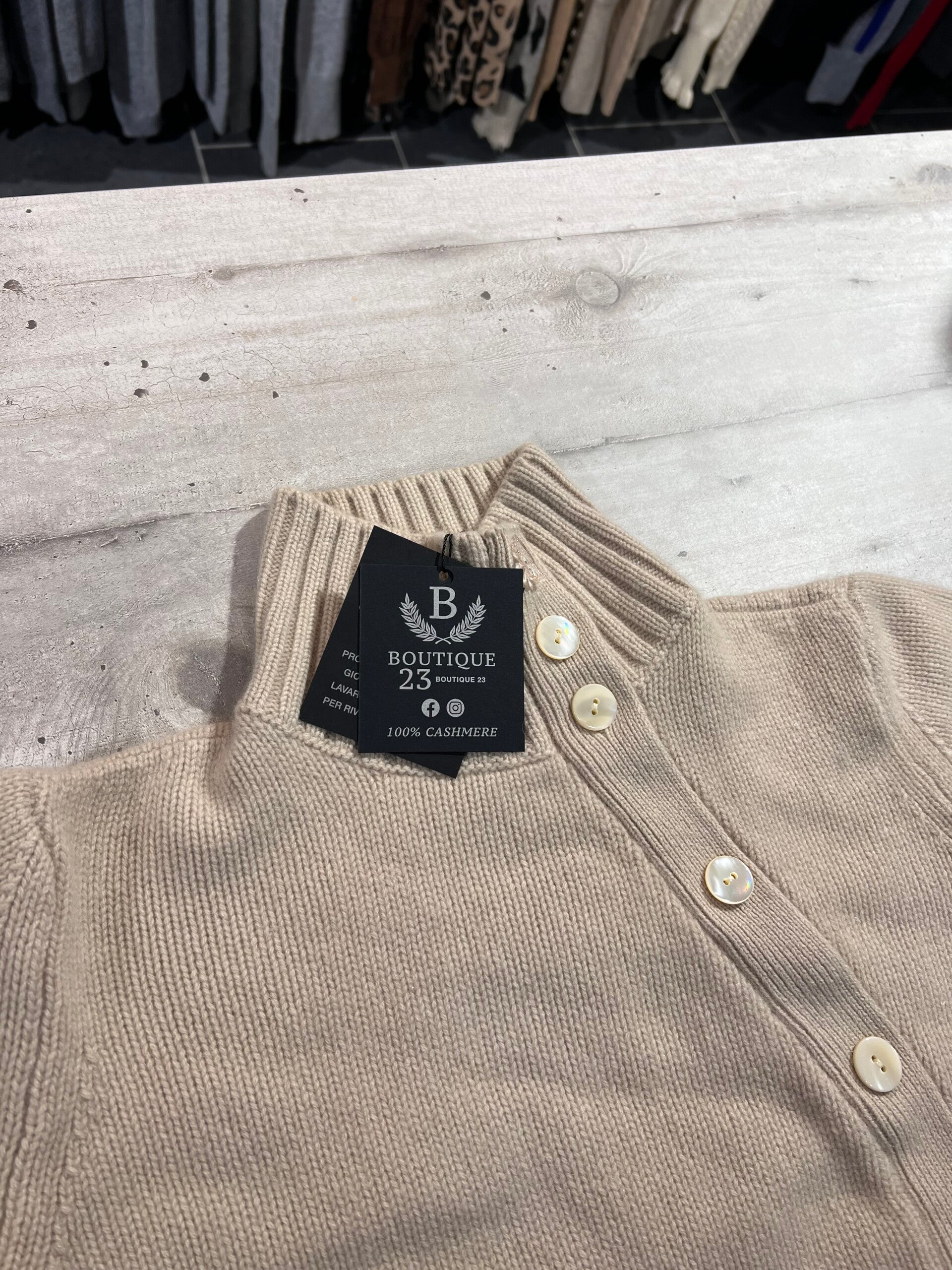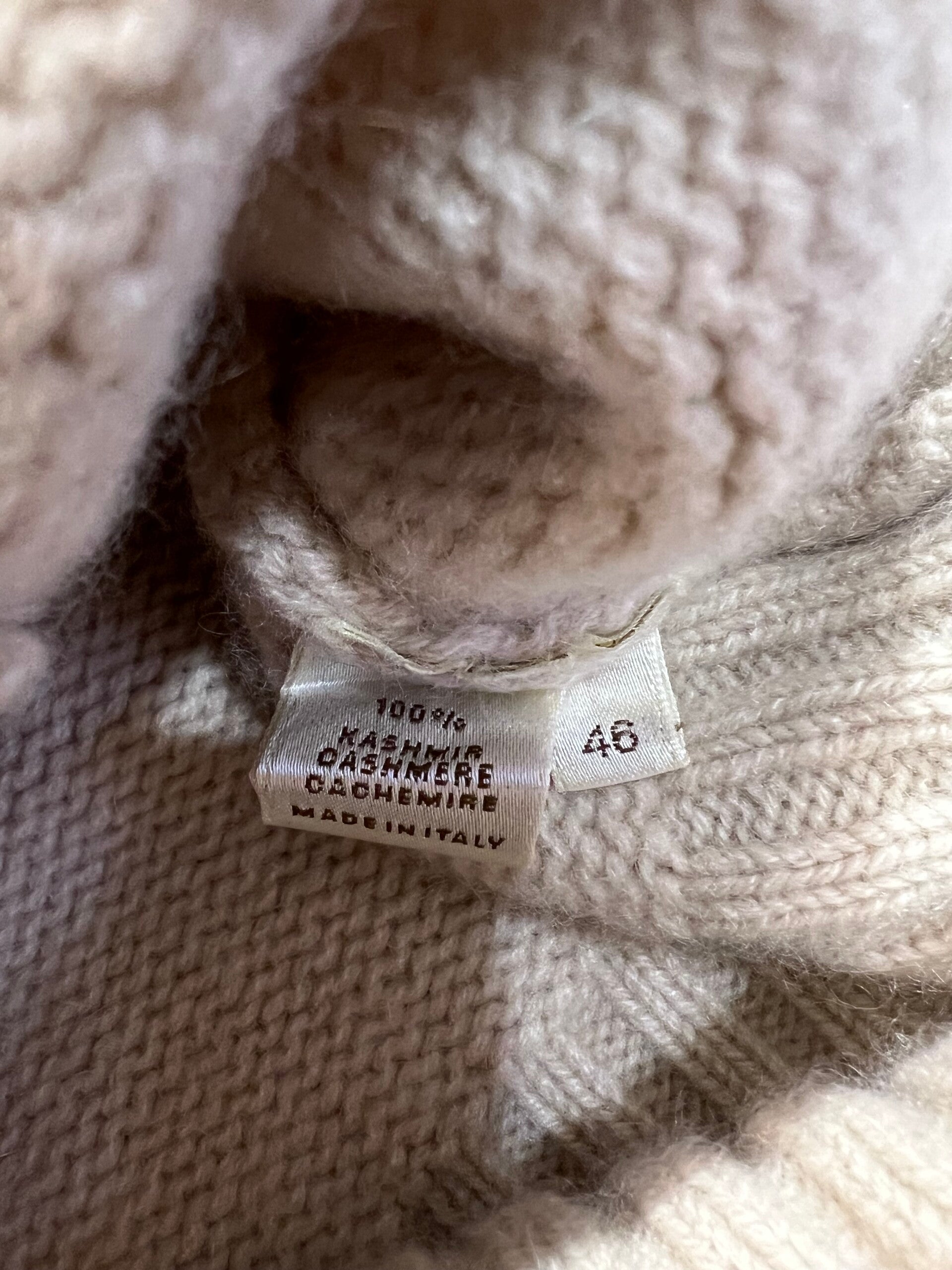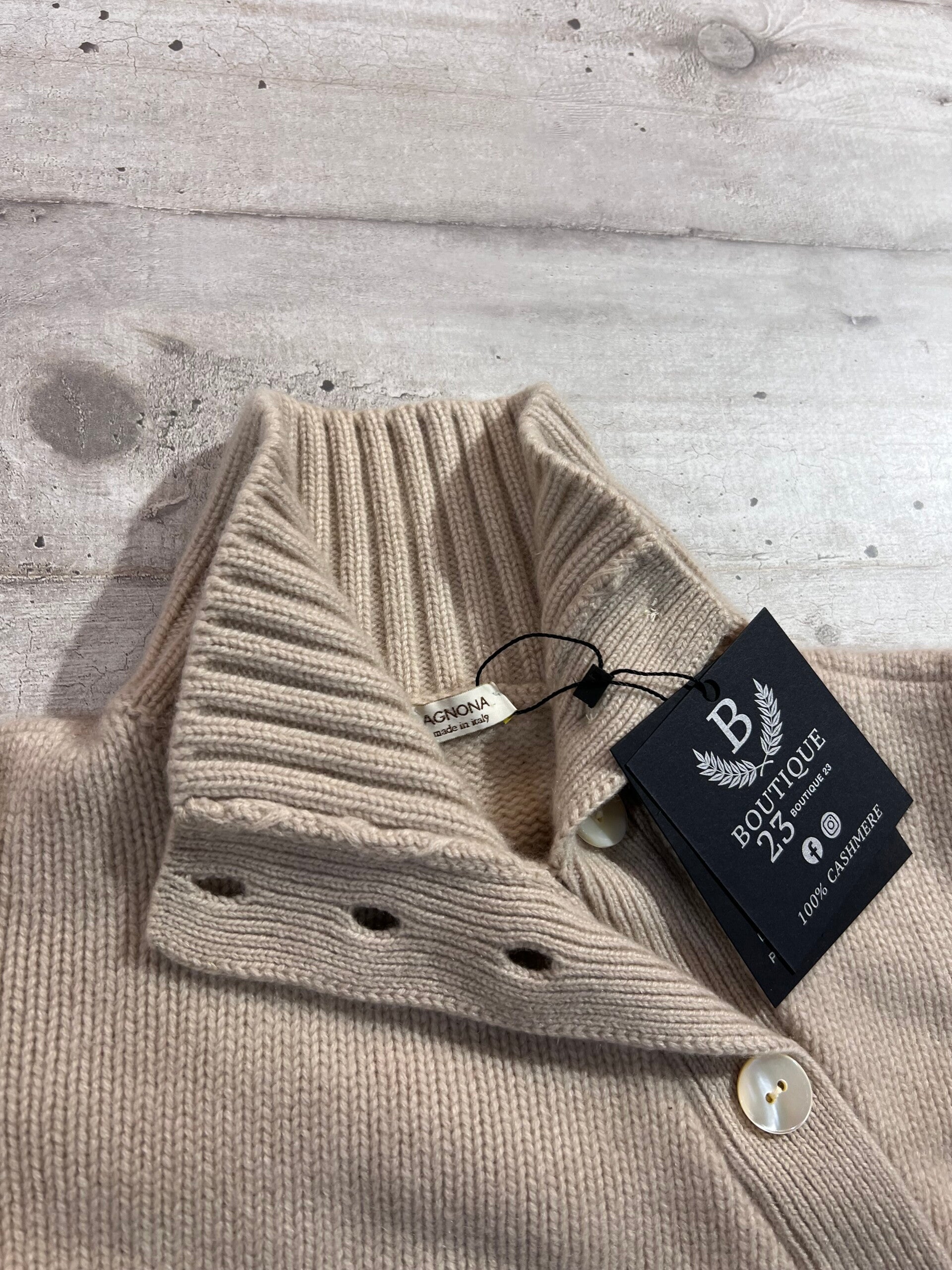 Maglione accollato 100% Puro Cashmere Donna. Agnona. Taglia IT46, veste una taglia M. Made in Italy. Maglione veramente molto molto pesante, adatto per le temperature rigide, veramente molto morbido e molto caldo. Il primo bottone è stato sostituto perché rotto, potete metterci poi quale volete se quello che ha non vi piace, si sbottonano solo tre bottoni, perfetto e molto bello. Misure: Spalle 38cm, sotto ascelle 48cm, lunghezza 60,5cm