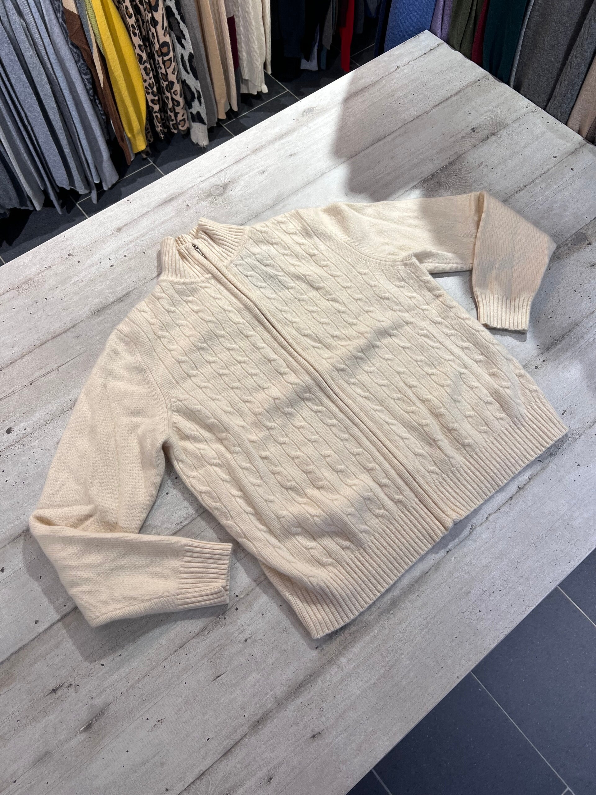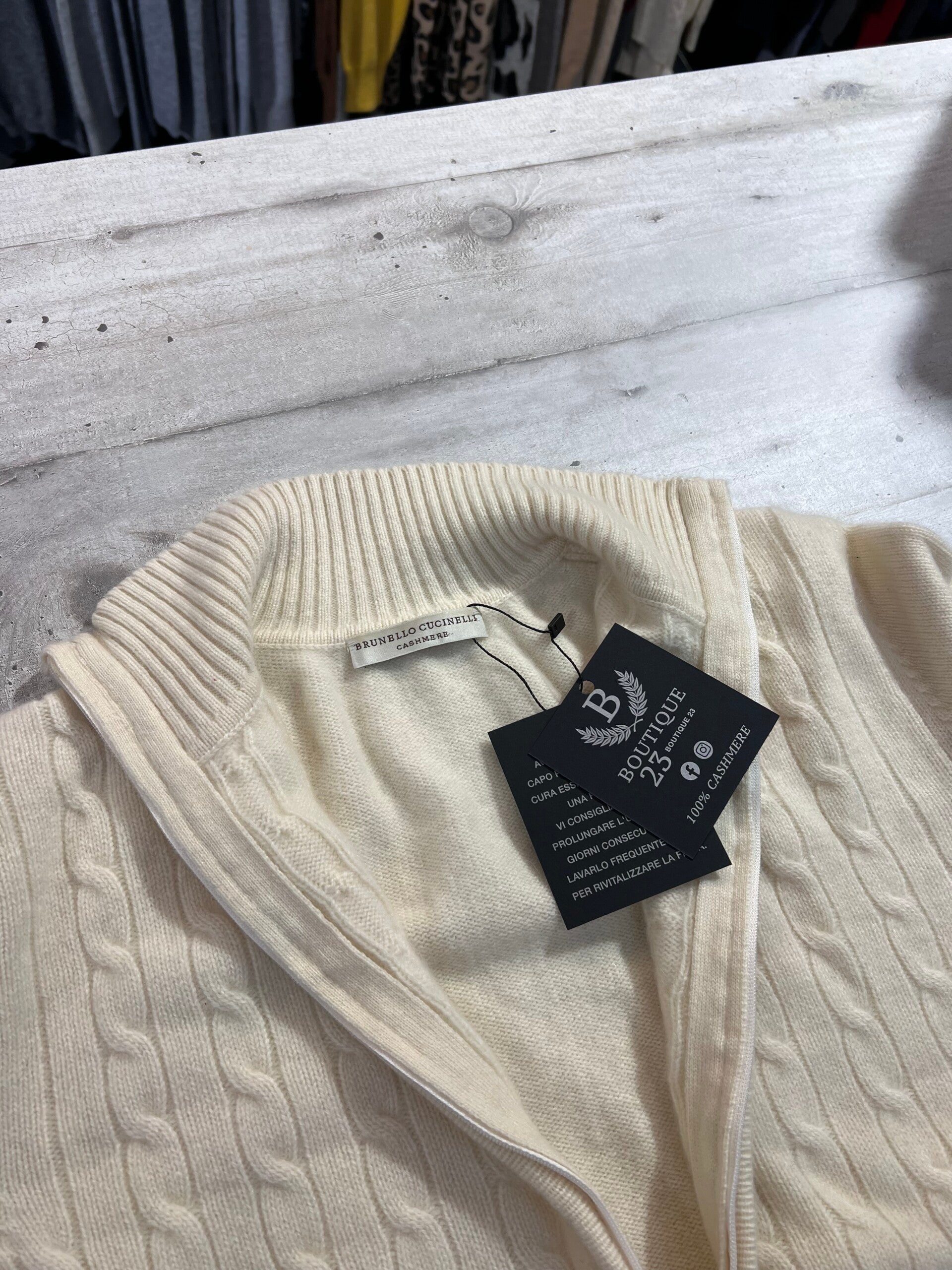 Maglione con zip 100% Puro Cashmere Donna Brunello Cucinelli. Taglia L. Made in Italy. Maglione di una morbidezza unica, molto spesso, caldo con motivo a trecce sul davanti. Misure: Spalle 40cm, sotto ascelle 52cm, lunghezza 59,5cm