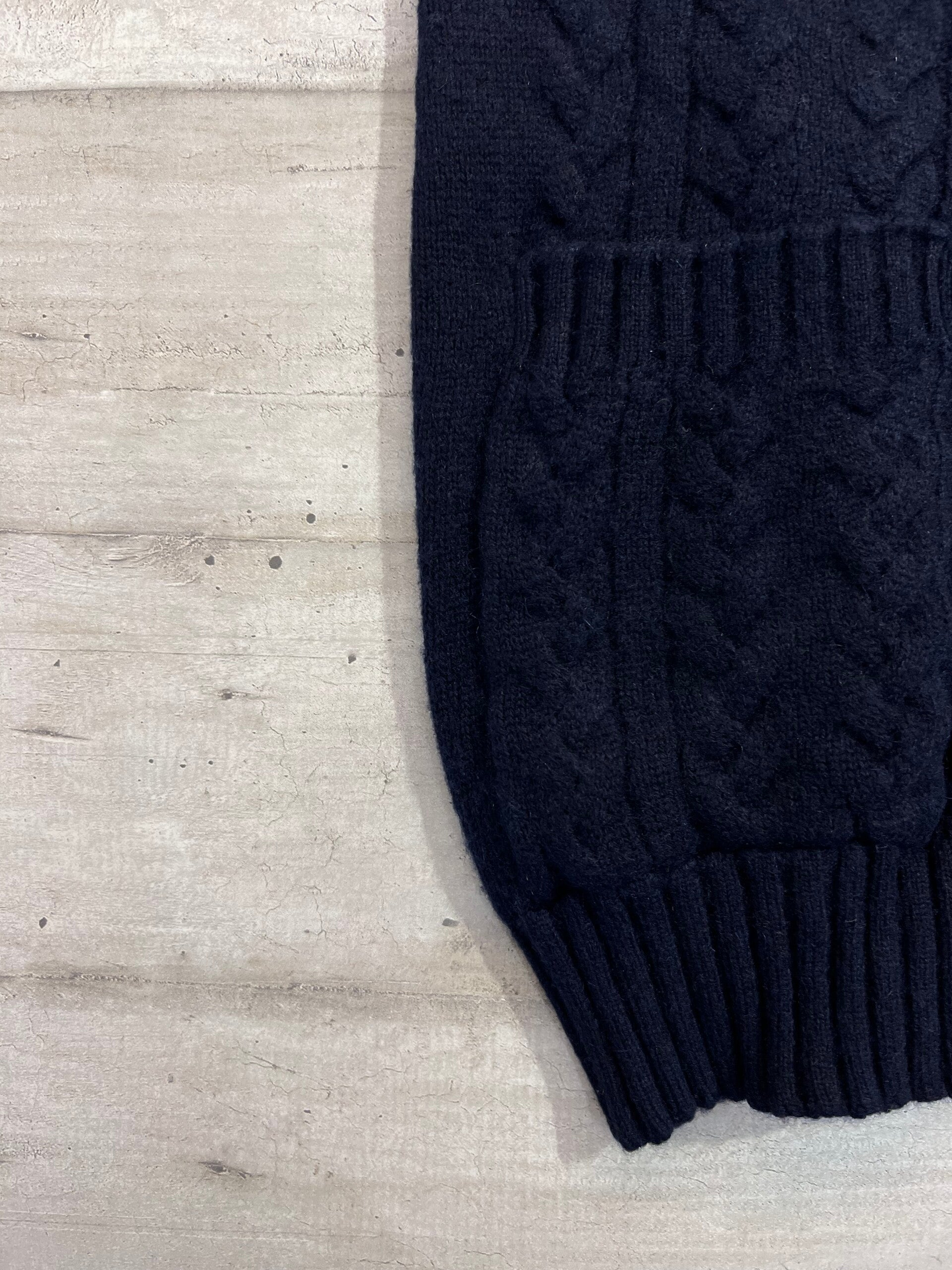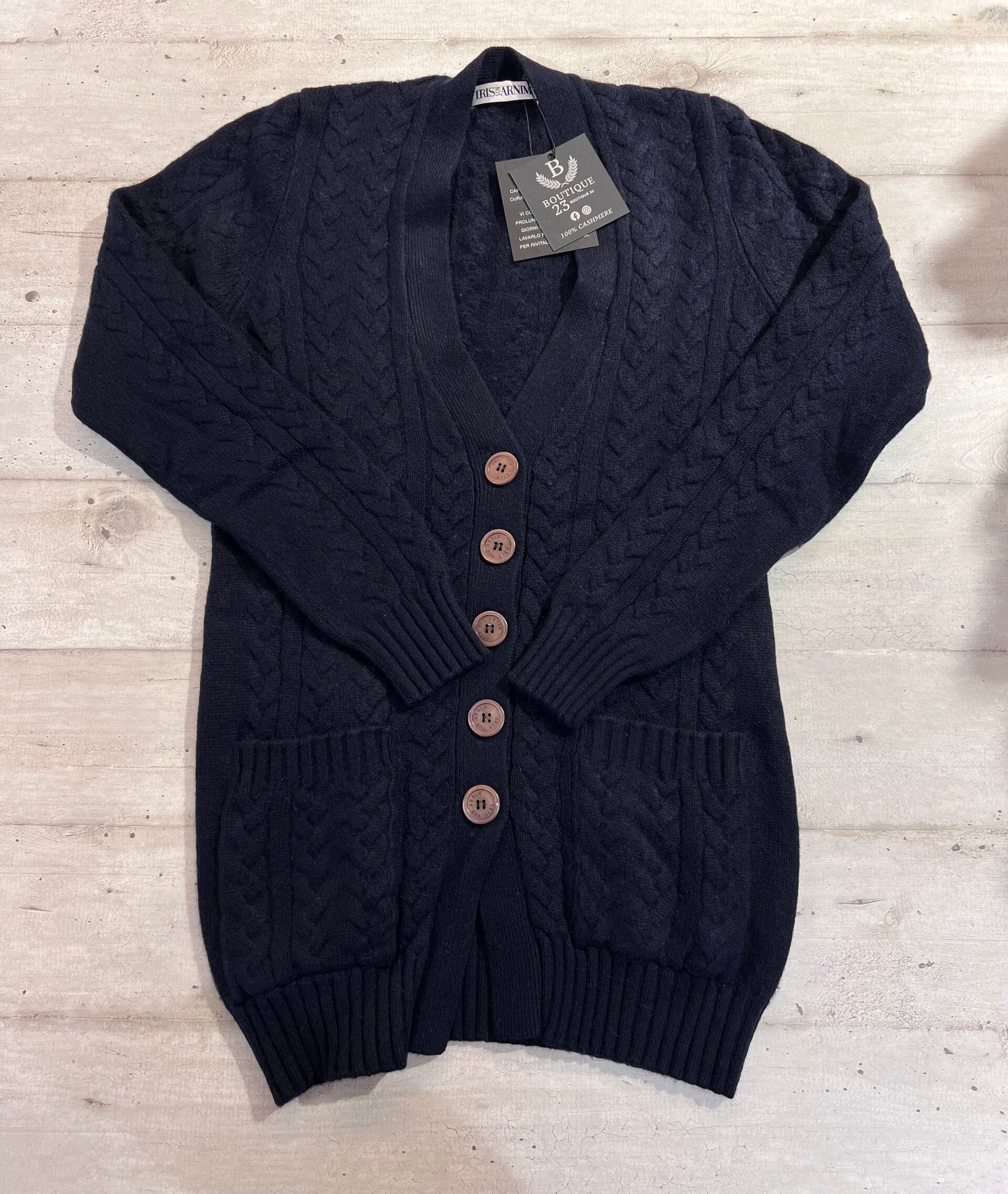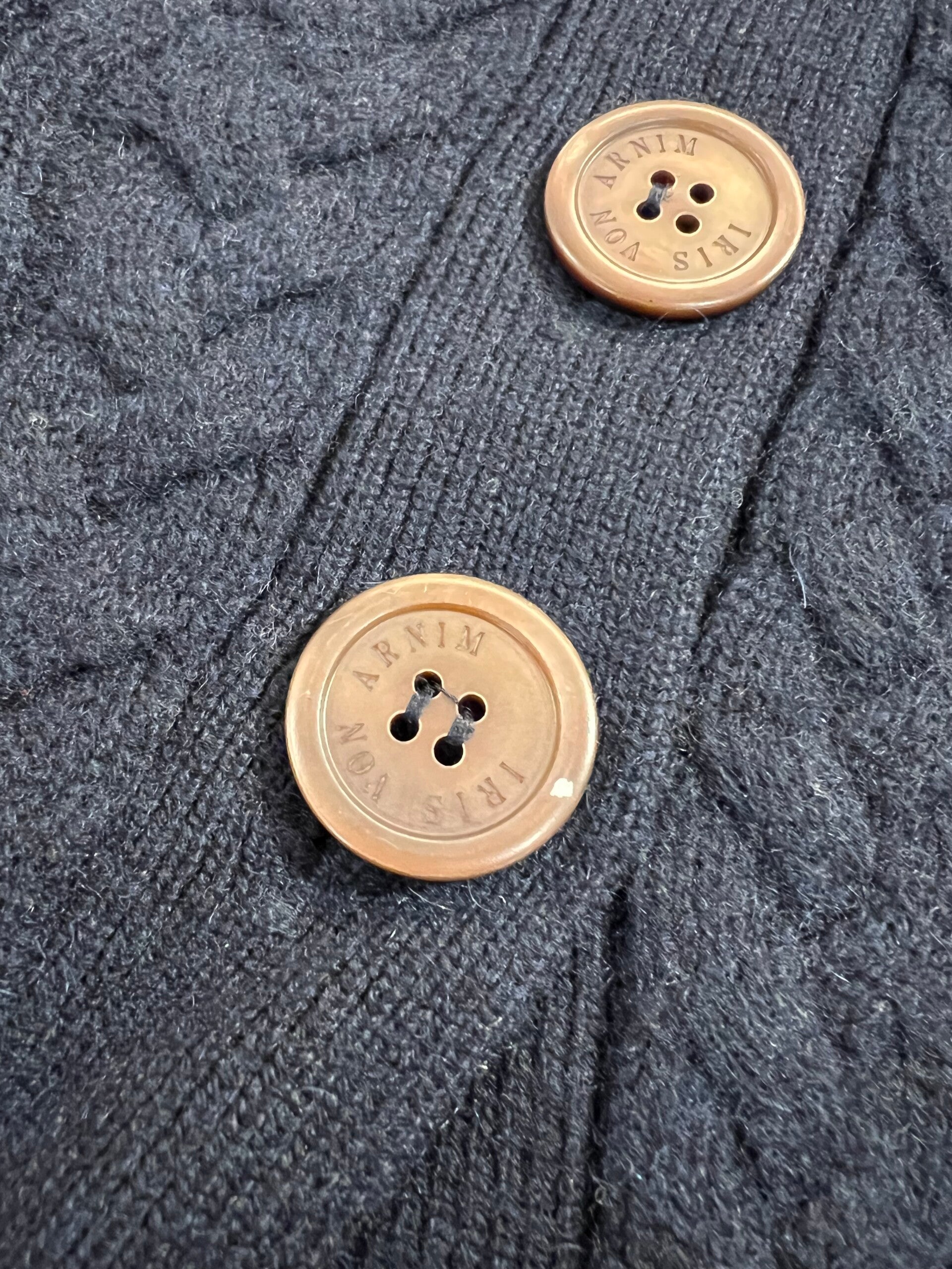Cardigan 100% Puro Cashmere Donna. Iris Von Arnim. Taglia S. Designed in Germany. Cardigan di una morbidezza unica, pesante, spesso, caldo con motivo a trecce e tasche, unica cosa l’ultimo bottone ha leggermente perso il colore come in foto. Misure: Spalle 34cm, sotto ascelle 46,5cm, lunghezza 74cm