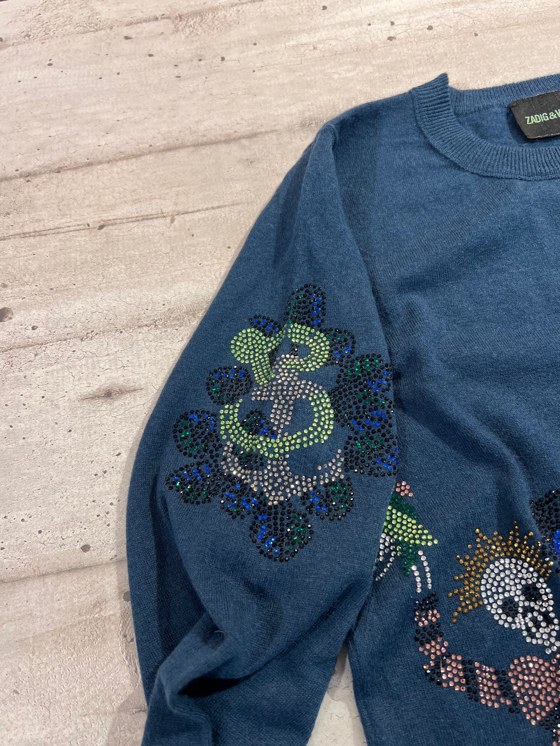 Maglia 100% Puro Cashmere Donna. Zadig & Voltaire. Taglia S. Maglia morbidissima, fine ma calda con strass con vari disegni. Misure: Spalle 34cm, sotto ascelle 45,5cm, lunghezza 58cm