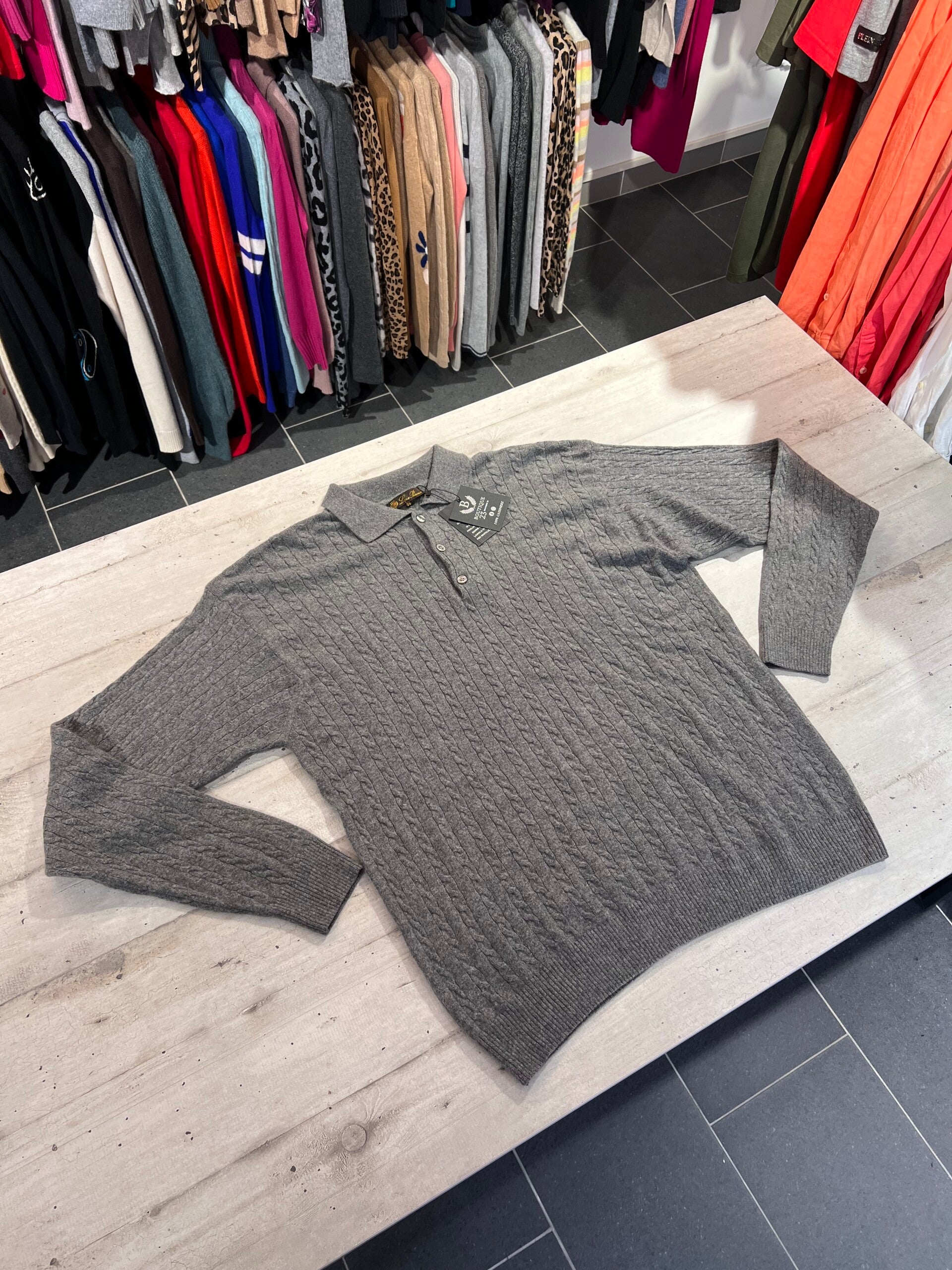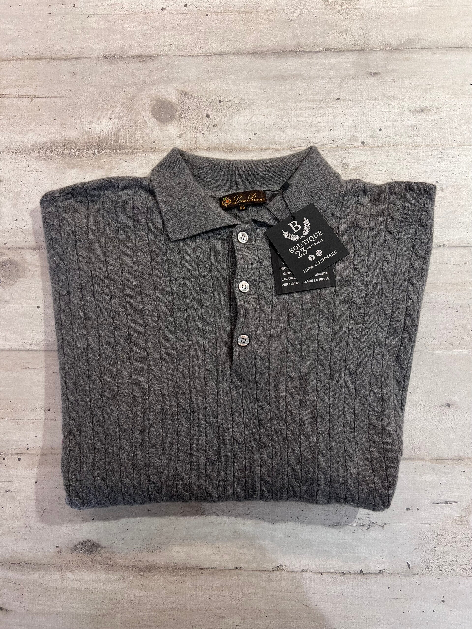 Maglione con colletto 100% Puro Cashmere Uomo. Loro Piana. Taglia IT56. Made in Italy. Maglione di una morbidezza unica, molto elegante, caldo con motivo a trecce. Misure: Spalle 59cm, sotto ascelle 62,5cm, lunghezza 75,5cm