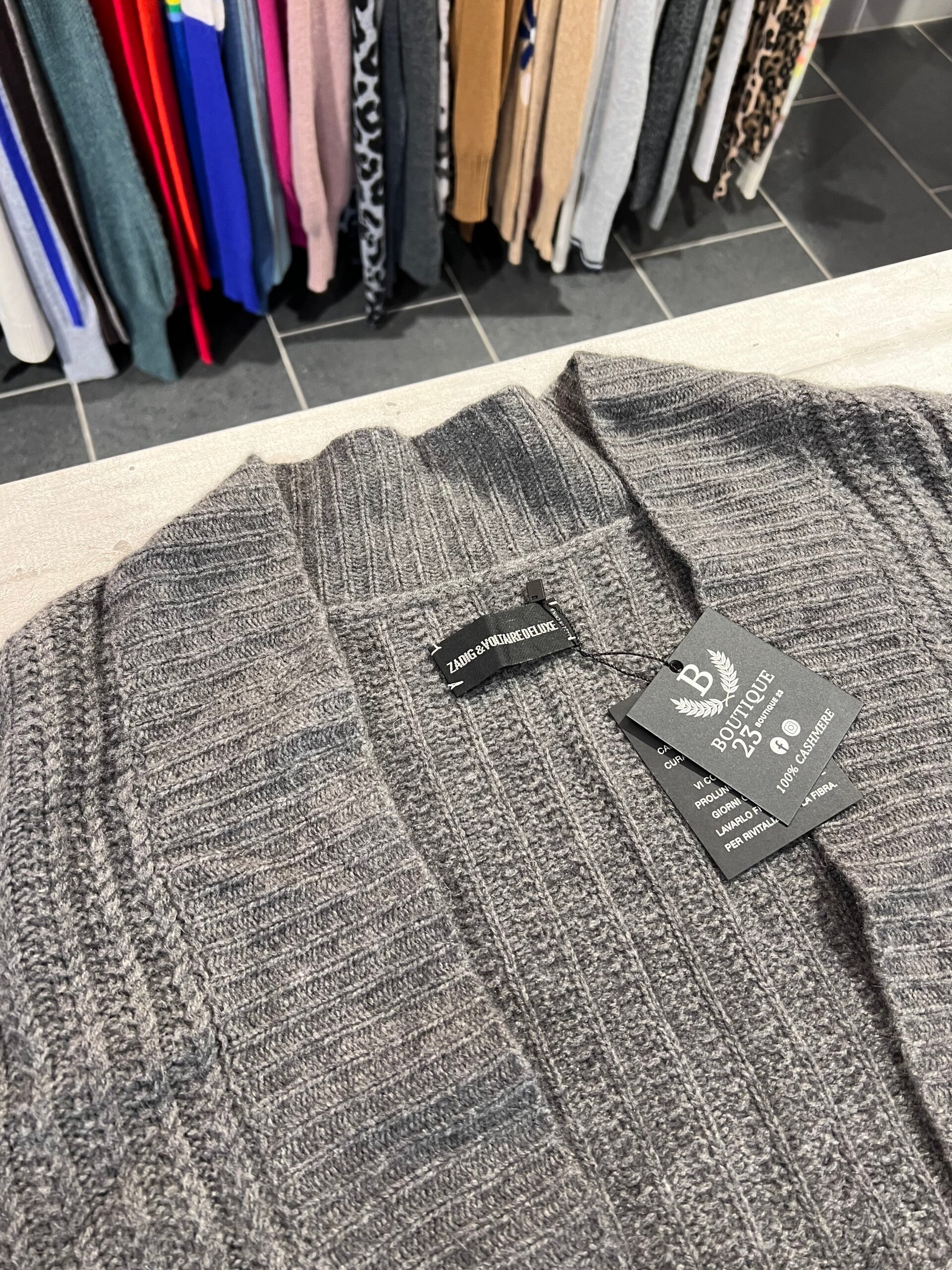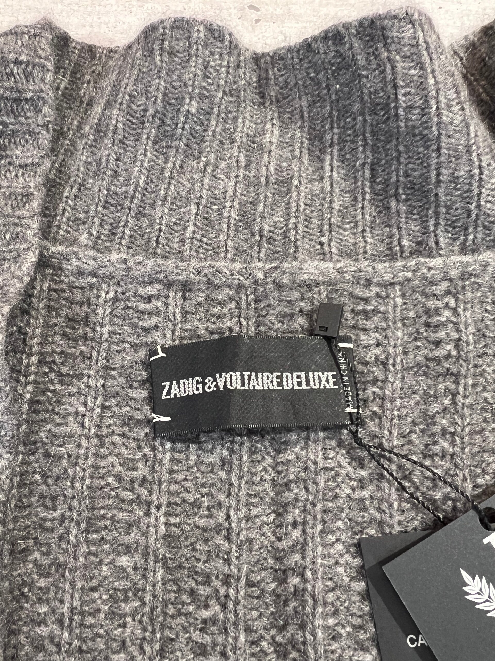 Cardigan 100% Puro Cashmere Donna. Zadig & Voltaire. Taglia S. Cardigan di una morbidezza unica, molto pesante, spesso e molto caldo con parte metallica della zig con la scritta del brand, con tasche e spacchi laterali. Misure: Sotto ascelle 63,5cm, lunghezza 82cm