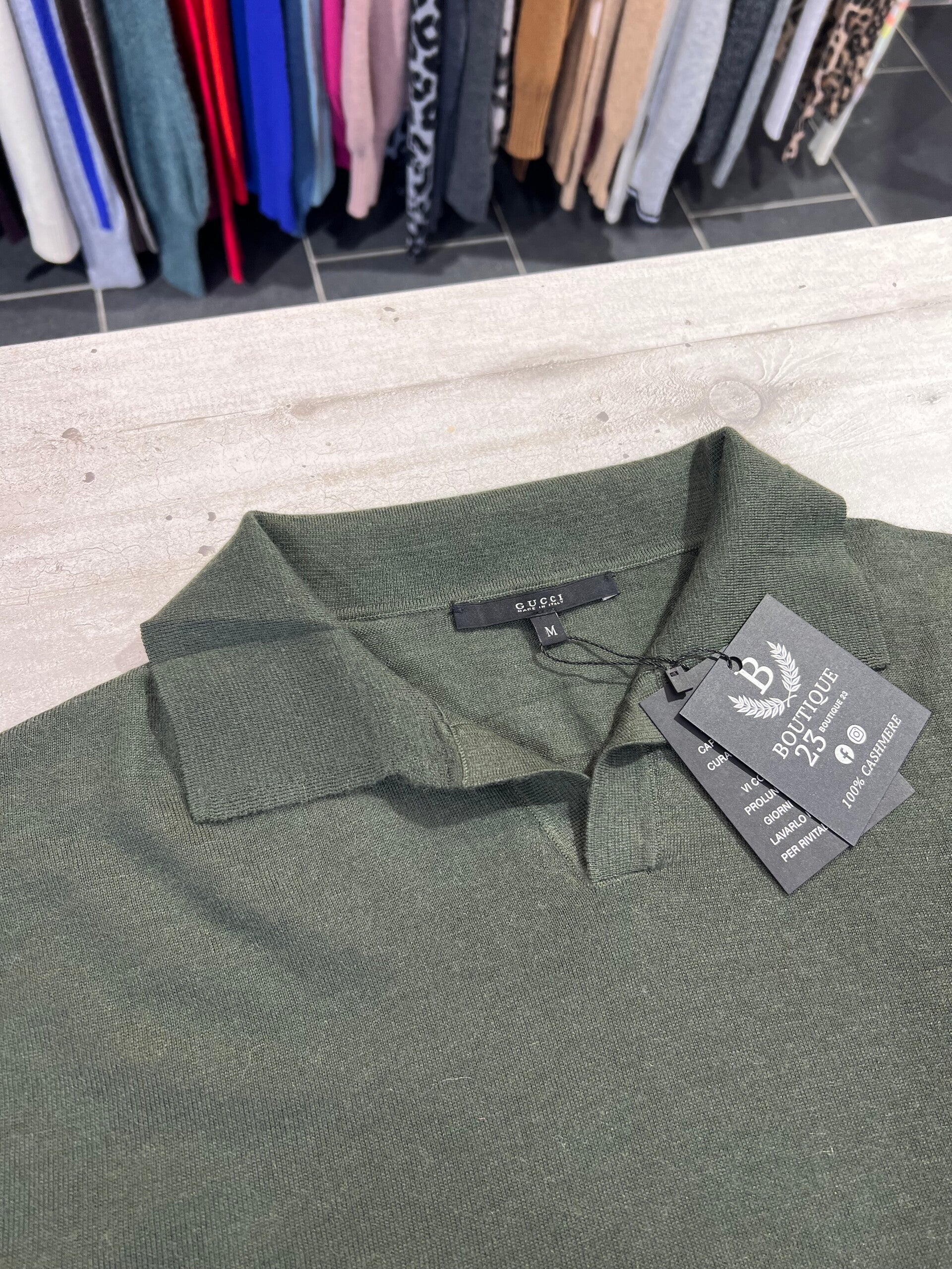 Maglia con colletto 100% Puro Cashmere Uomo. Gucci. Taglia M. Made in Italy. Maglia di una morbidezza unica, leggera e molto bella. Misure: Spalle 49,5cm, sotto ascelle 56cm, lunghezza 66,5cm